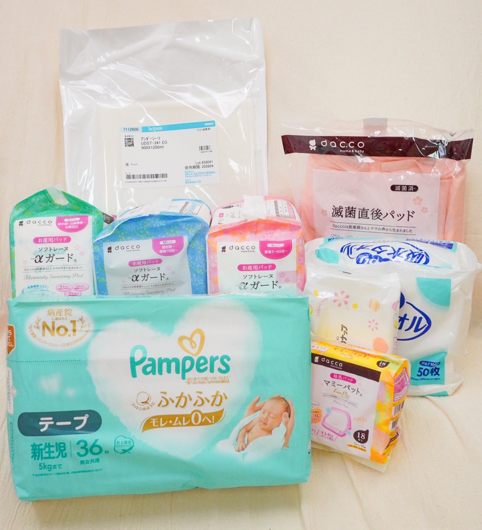 リペアニプル、おむつ、おしり拭き、ショーツ、授乳用ブラジャー、お産用ナプキン(L)など