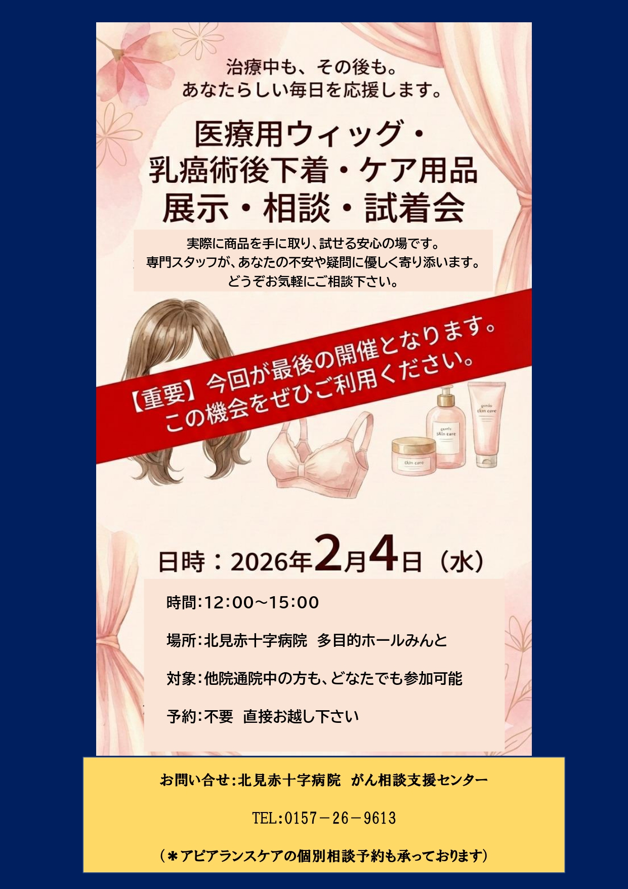 アピアランスケア アピアランスケアについて「アピアランス」とは、外見・外観・容姿・見かけなどのことを言います。がん治療(手術・がん化学療法・放射線治療)により、脱毛や皮膚の変色、爪の変化や傷跡などで外見の変化がおこることがあります。外見の変化は、社会生活に影響し「人に会いたくない」「周りの人からどう思われるか心配」「自分らしく過ごせない」という苦痛を抱える方もいらっしゃいます。患者さんが安心して療養生活が送れるように、お気持ちの整理のお手伝いや、ウィッグの使用や対応方法などを一緒に考えます。アピアランスコーナーについて本館2階 外来化学療法センター入り口横にございます。平日9:00~16:00の間、ウィッグ、ケア帽子、人工乳房、乳がん術後下着、ネイルなど、カタログだけでなく実物も用意しているので実際に手に取ってお試しいただけます。 アピアランスケア リーフレット横浜市、横浜市内でアピアランスケアに取り組む医療者、国立がん研究センター中央病院が協力してアピアランスケアリーフレットを作成しています。以下のサイトからご覧ください。「国立研究開発法人国立がん研究センター」のホームページに移動します。 医療用ウィッグ、乳がん術後下着・ケア用品の相談・試着会の開催 ご相談フォームアピアランスケアについての様々な疑問や質問を受付けております。気軽にご連絡下さい。 お名前 (必須) ※医療関係者の方は医療機関名もご入力下さい。 メールアドレス (必須) 電話番号(任意) ご相談内容(簡単で結構です)